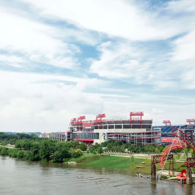 Nissan Stadium, home of the Tennessee Titans, is a state-of-the-art, open-air facility with seating for approximately 69,143 fans, including nearly 12,000 premium club seats. Situated on 105 acres along Nashville’s East Bank of the Cumberland River, the stadium offers sweeping views of the downtown skyline.